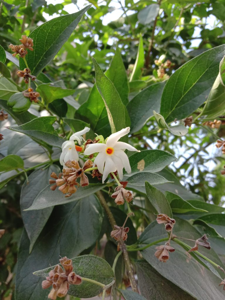 - పారిజాతం పూలు తెల్లని రేకులను కలిగి ఉండి, మధ్యలో మరియు కాడ భాగం నారింజ రంగులో (Bright Orange) ఉంటాయి.